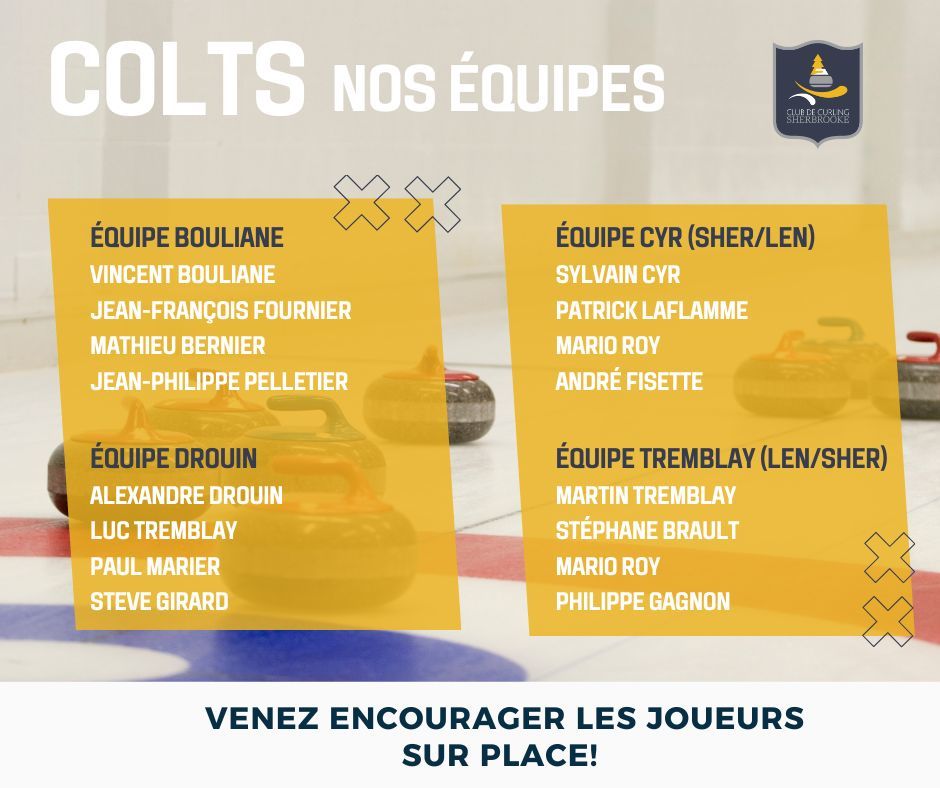 Du 20 au 22 février, nous accueillerons un tournoi du circuit Colts de Curling Québec pour les curleurs ayant 5 ans et moins d'expérience.